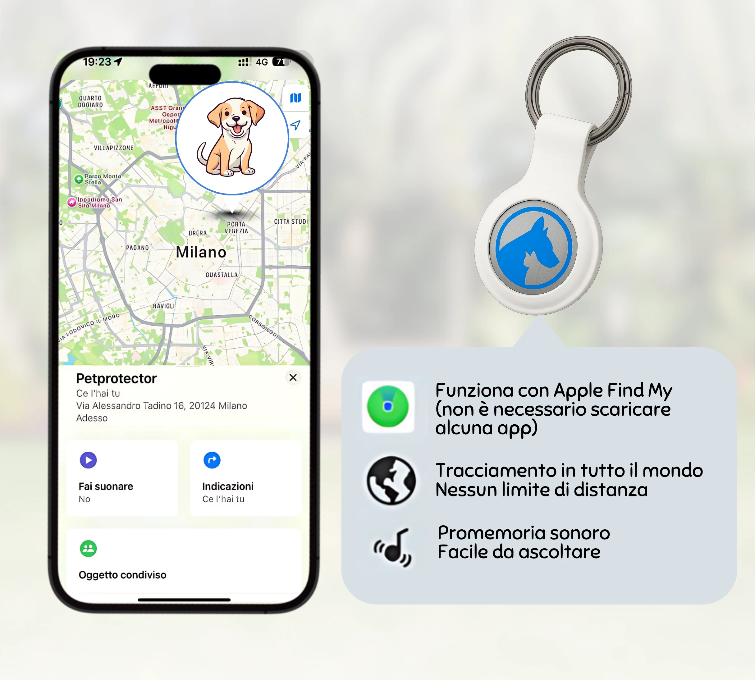 Funziona direttamente con il tuo iPhone, senza app esterne, e ti consente di localizzare il tuo animale ovunque grazie alla rete “Dov'è” di Apple, presente in tutto il mondo.